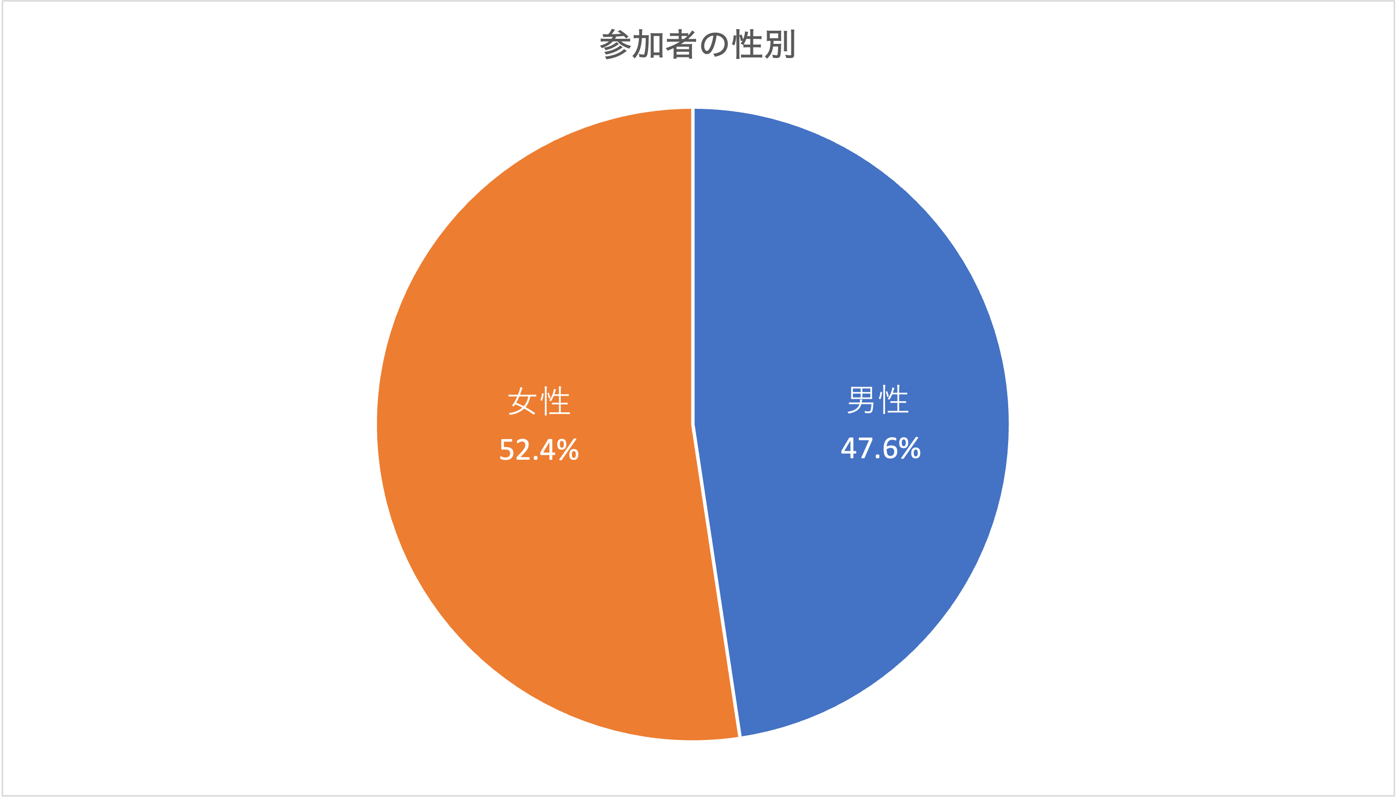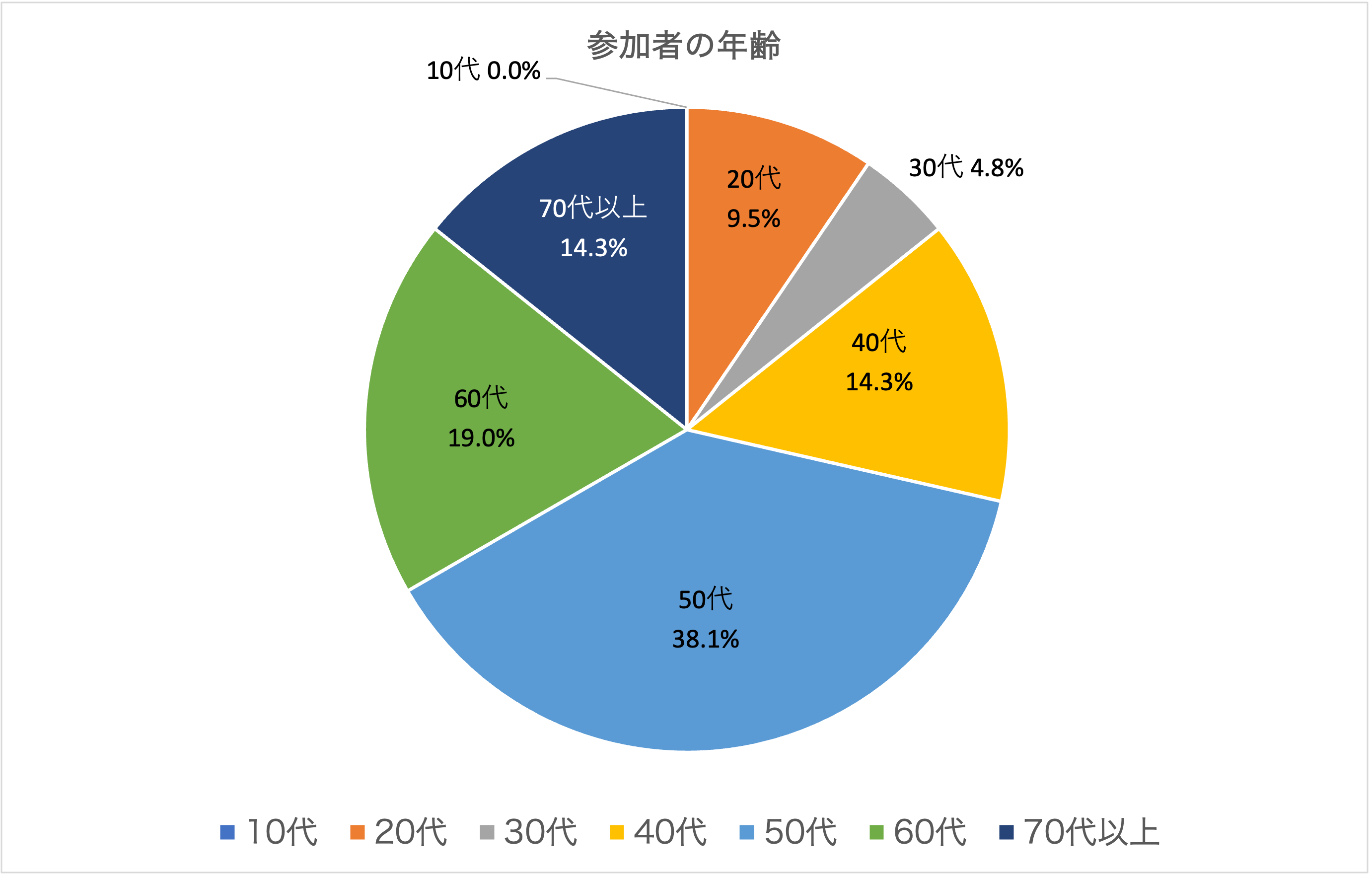 10代:0.0%(0名)、20代:9.5%(2名)、30代:4.8%(1名)、40代:14.3%(3名)、50代:38.1%(8名)、60代:19.0%(4名)、70代以上:13.3%(3名)