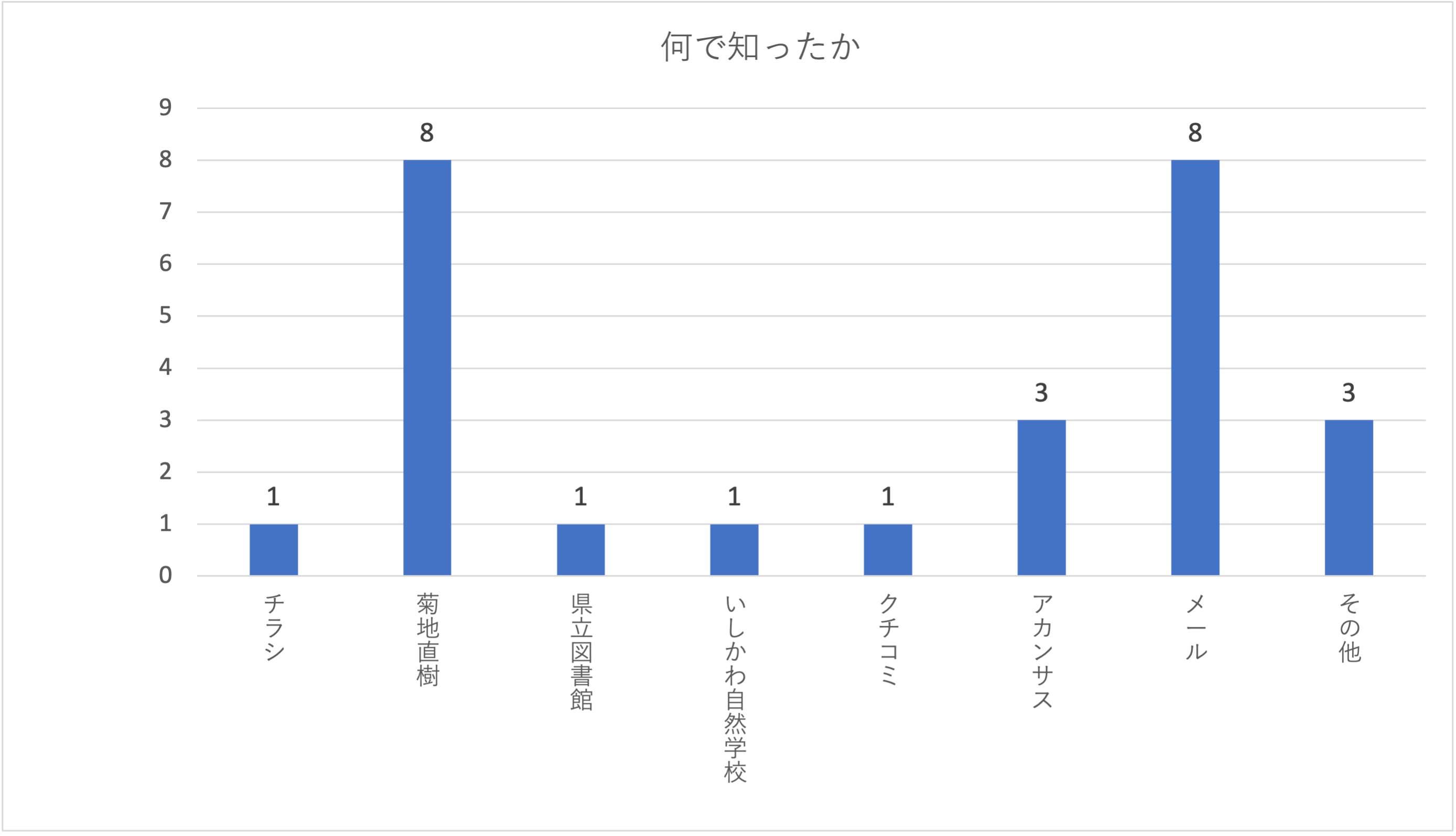 チラシが4.8%(1名)、菊地直樹のサイト/フェイスブックが38.1%(8名)、県立図書館が4.8%(1名)、いしかわ自然学校が4.8%(1名)、クチコミ4.8%(1名)、金沢大学のアカンサスポータルが14.3%(3名)、ダイレクトメールが38.1%(8名)、その他が14.3%(3名)でした。