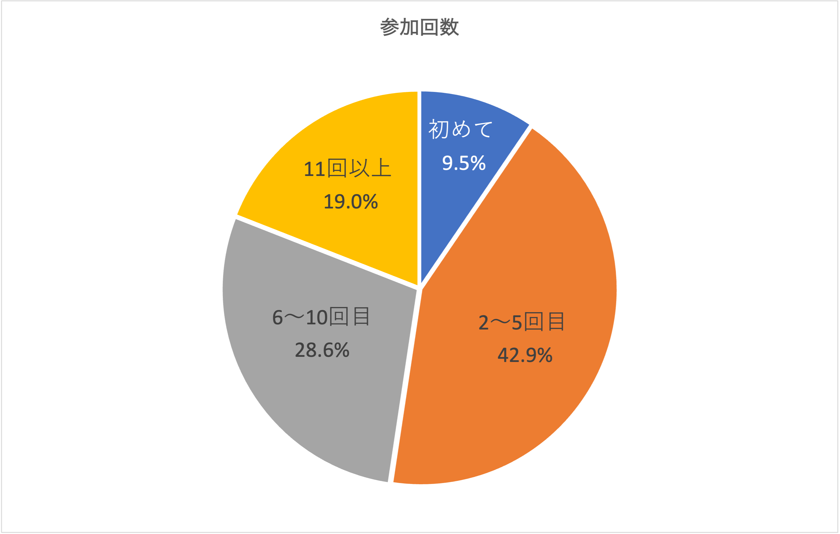 初めてが9.5%(2名)、2〜5回目が42.9%(9名)、6〜10回目が28.6%(6名)、11回以上が19.0%(4名)でした。