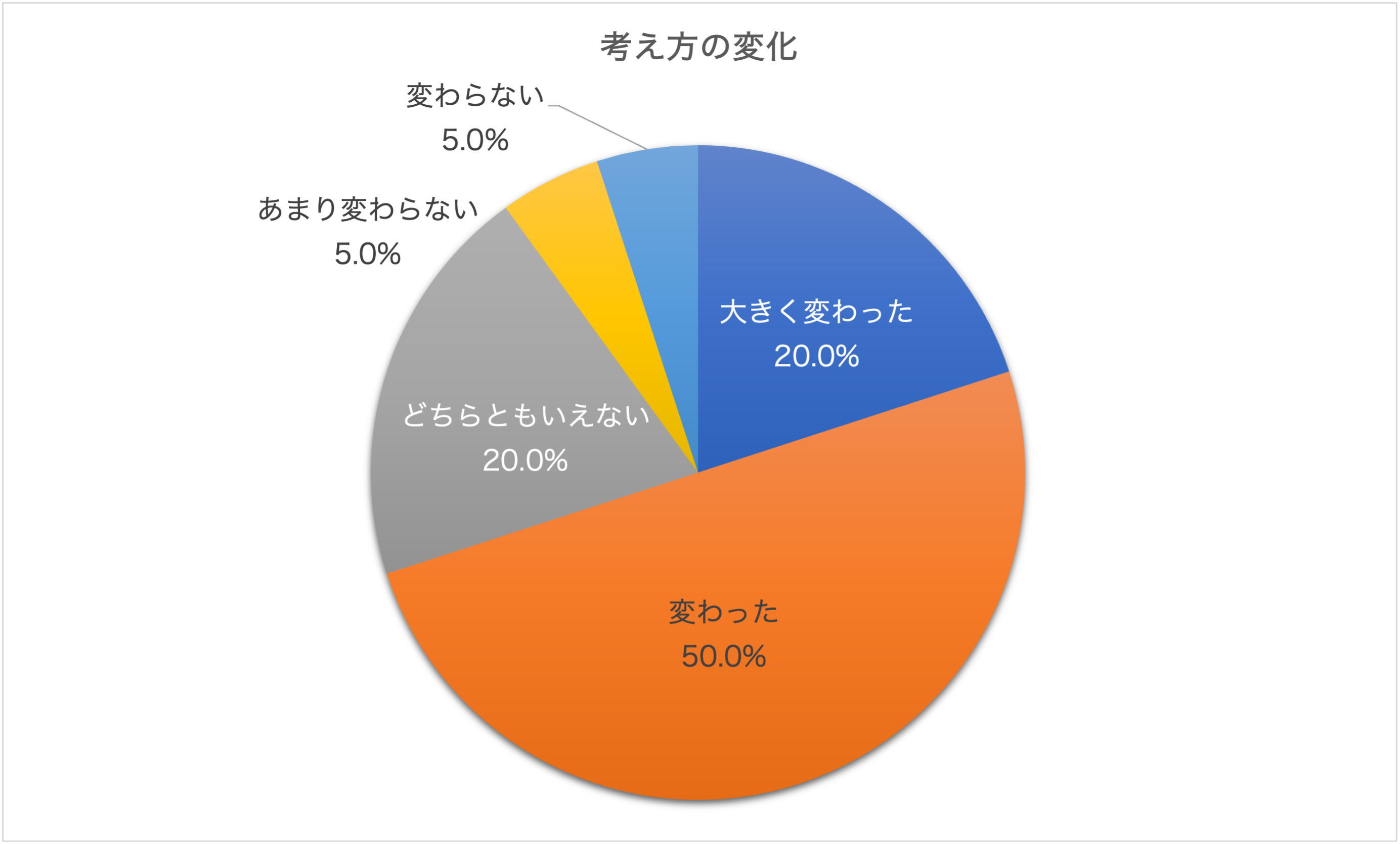 大きく変わった:20.0%(4名)、変わった:50.0%(10名)、どちらともいえない:20.0%(4名)、あまり変わらない:5.0%(1名)、変わらない:5.0%(1名)
