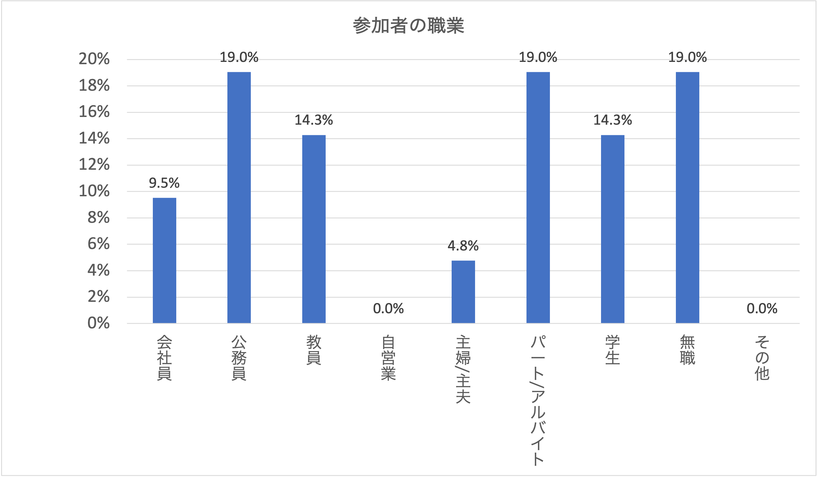 会社員:9.5%(2名)、公務員:19.0%(4名)、教員:14.3%(3名)、自営業:0.0%(0名)、主婦/主夫:4.8%(1名)、パート/アルバイト:19.0%(4名)、学生:14.3%(3名)、無職:19.0%(4名)、その他:0.0%(0名)
