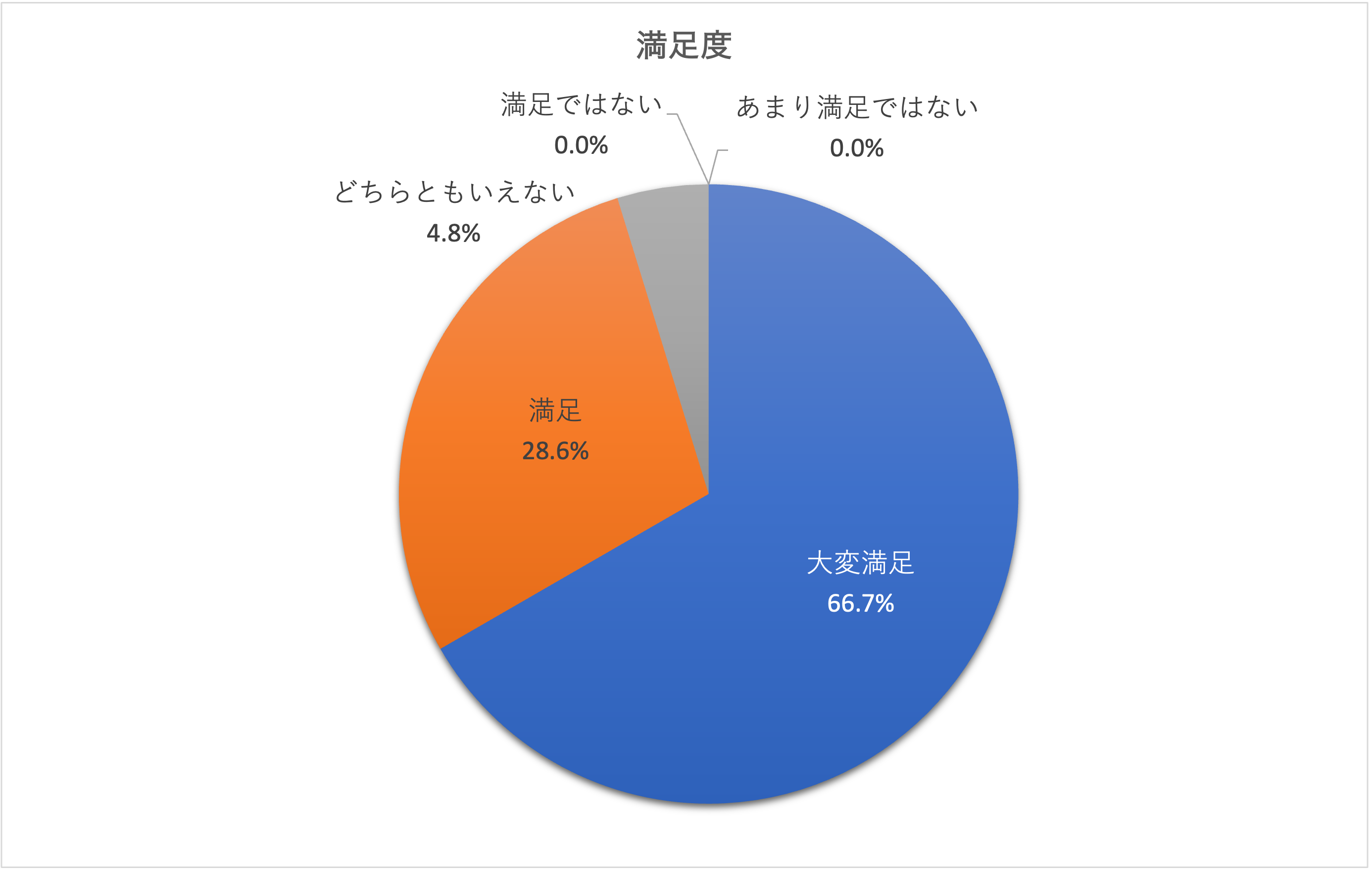 大変満足:66.7%(14名)、満足:28.6%(16名)、どちらともいえない4.8%(1名)、あまり満足ではない:0.0%(0名)、満足ではない:0.0%(0人)